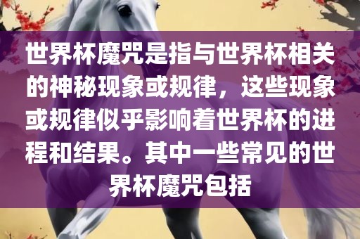 世界杯魔咒是指与世界杯相关的神秘现象或规律,这些现象或规律似乎影响着世界杯的进程和结果。其中一些常见的世界杯魔咒包括