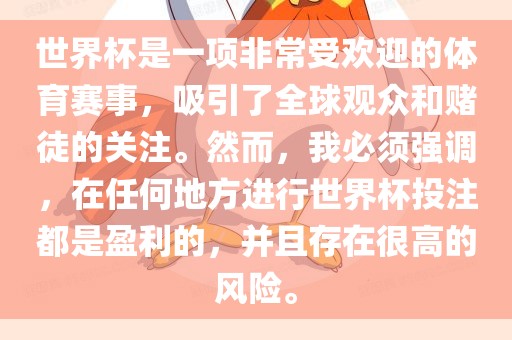 世界杯是一项非常受欢迎的体育赛事,吸引了全球观众和赌徒的关注。然而,我必须强调,在任何地方进行世界杯投注都是盈利的,并且存在很高的风险。