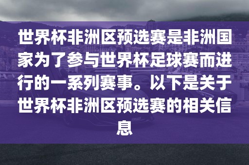 世界杯非洲区预选赛是非洲国家为了参与世界杯足球赛而进行的一系列赛事。以下是关于世界杯非洲区预选赛的相关信息